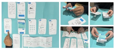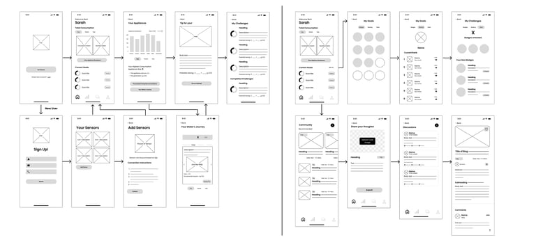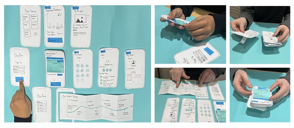 Two rounds of paper prototyping were conducted to refine the app’s primary user journey, including viewing water consumption, appliance breakdowns, and personalised tips. In the first round, users navigated initial screens and highlighted issues such as unclear terminology (“forum”), an overcrowded home screen, and a preference for a more community-focused, social style. The second round tested the full “happy path,” leading to further insights: navigation worked better at the bottom, time indicators needed clarification, and badge designs were visually confusing. These findings informed key design changes, including repositioned navigation, a simplified home screen, clearer timelines, revised badge styles, and fewer unnecessary clicks to streamline user interaction.