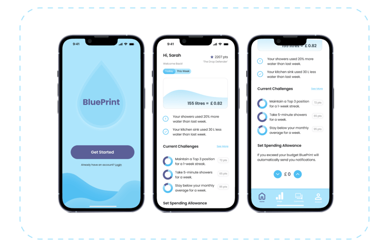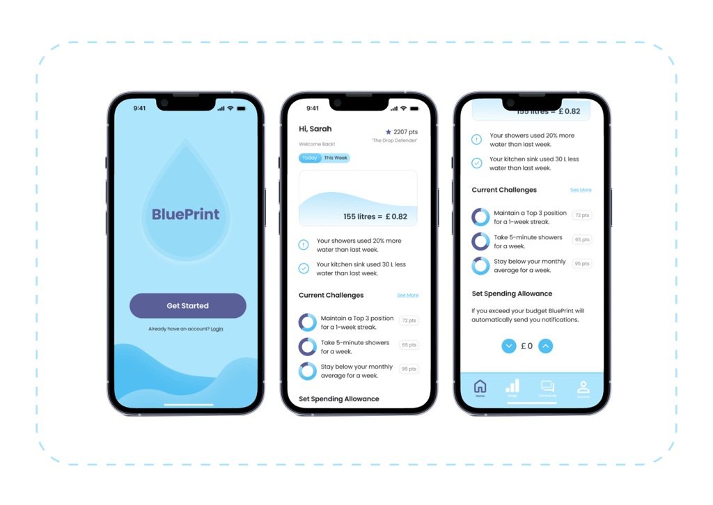 BluePrint aims to reduce water usage by educating users about the direct environmental and financial impact of their per-appliance consumption while providing actionable water-saving recommendations.