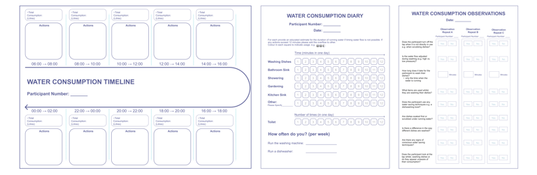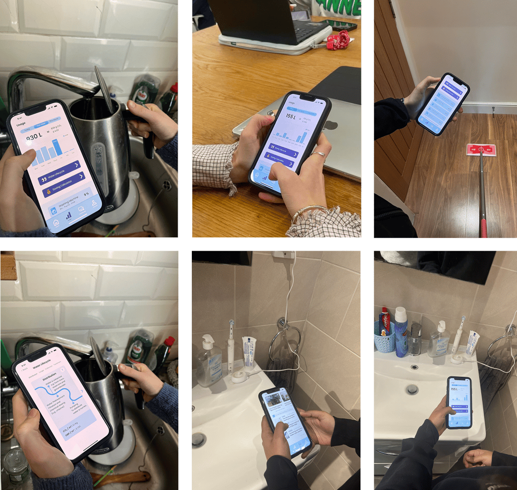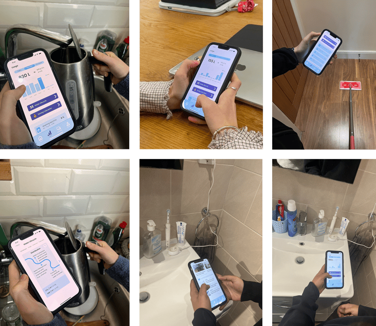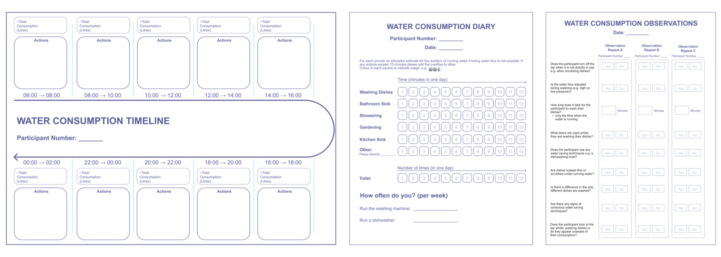 A mixed-methods user research study explored students’ water-use habits through interviews, a 24-hour diary, and observations. Interviews revealed that participants significantly underestimated their water consumption, especially for toilets and showers. The diary method provided more accurate, quantitative insight and showed that tracking usage made participants more aware of their habits. Observations of students washing dishes found little use of water-saving behaviours and highlighted low awareness of simple conservation techniques. Overall, the research emphasised the need for clearer feedback, easier tracking, and practical guidance to help users reduce water consumption.