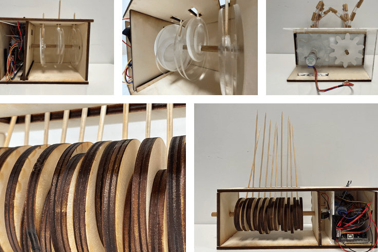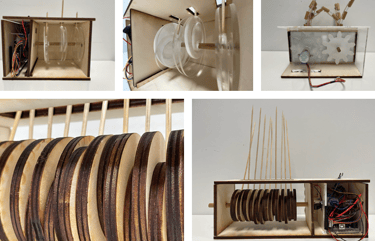 1. 'The Fingers' - Eight fingers modelled using wooden blocks, springs and strings close when an IR sensor detects a hand over the structure. This is done through strings that are wound and unwound around a shaft which is rotated using a stepper motor.