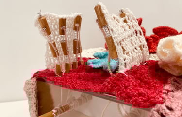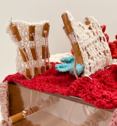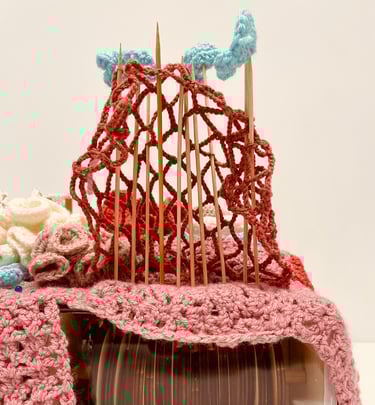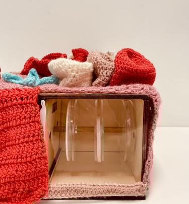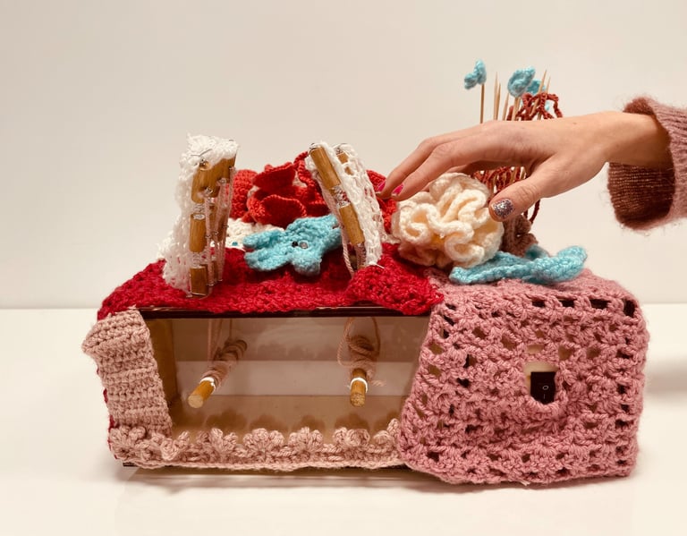 2. 'The Bop' - Eye hooks are used to attach crochet to cams. When the IR sensors detect a hand over the structure the motor rotates the coral moves in an up/down motion. As the crochet is so light the cam follower was attached to a ring that rotates around the cam following its shape.