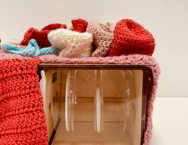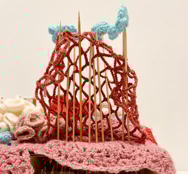 The initial inspiration behind the Coral of Curiosity was crochet's ability to accurately model the hyperbolic form of coral. Throughout this project, crochet has been combined with electrical and mechanical systems to create an interactive coral environment where the crochet comes alive. The eco-system consists of three separate mechanisms which each interact with the user in individual ways, provoking curiosity.