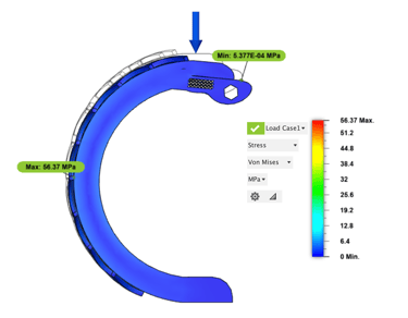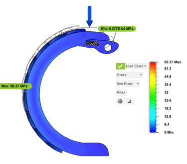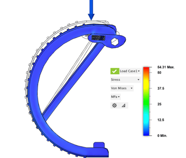 Central Legs - The initial analysis showed that the leg could support the 6N force, though a risk of failure was still identified. This failure was likely due to excessive bending under the load. To significantly reduce this risk, the thickness of the leg arc was increased by 2 mm throughout. This adjustment resulted in a 71% reduction in the maximum stress experienced by the leg.